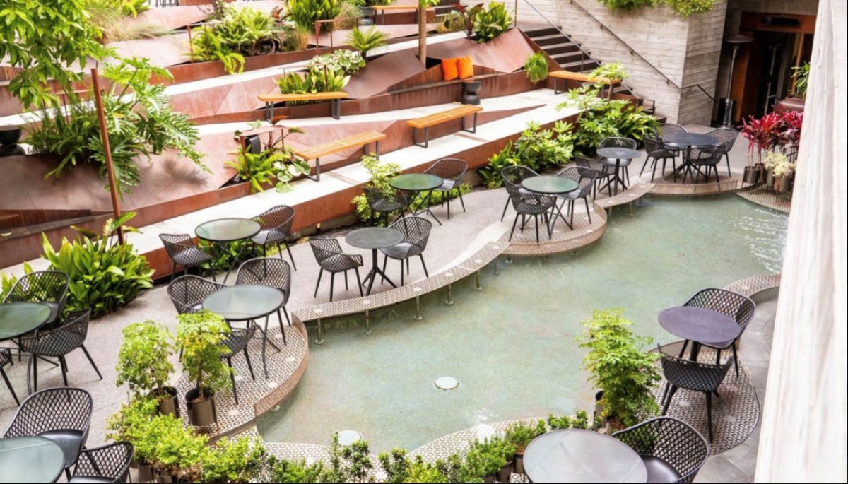 Upon entering InsideOUT, you find an outdoor, open-air atrium featuring walkways, seating areas, and a central water element. It serves as a genuine second “room” for events, not merely sidewalk seating. The layout facilitates easy setup for welcome drinks as guests move toward tables or reserved zones.