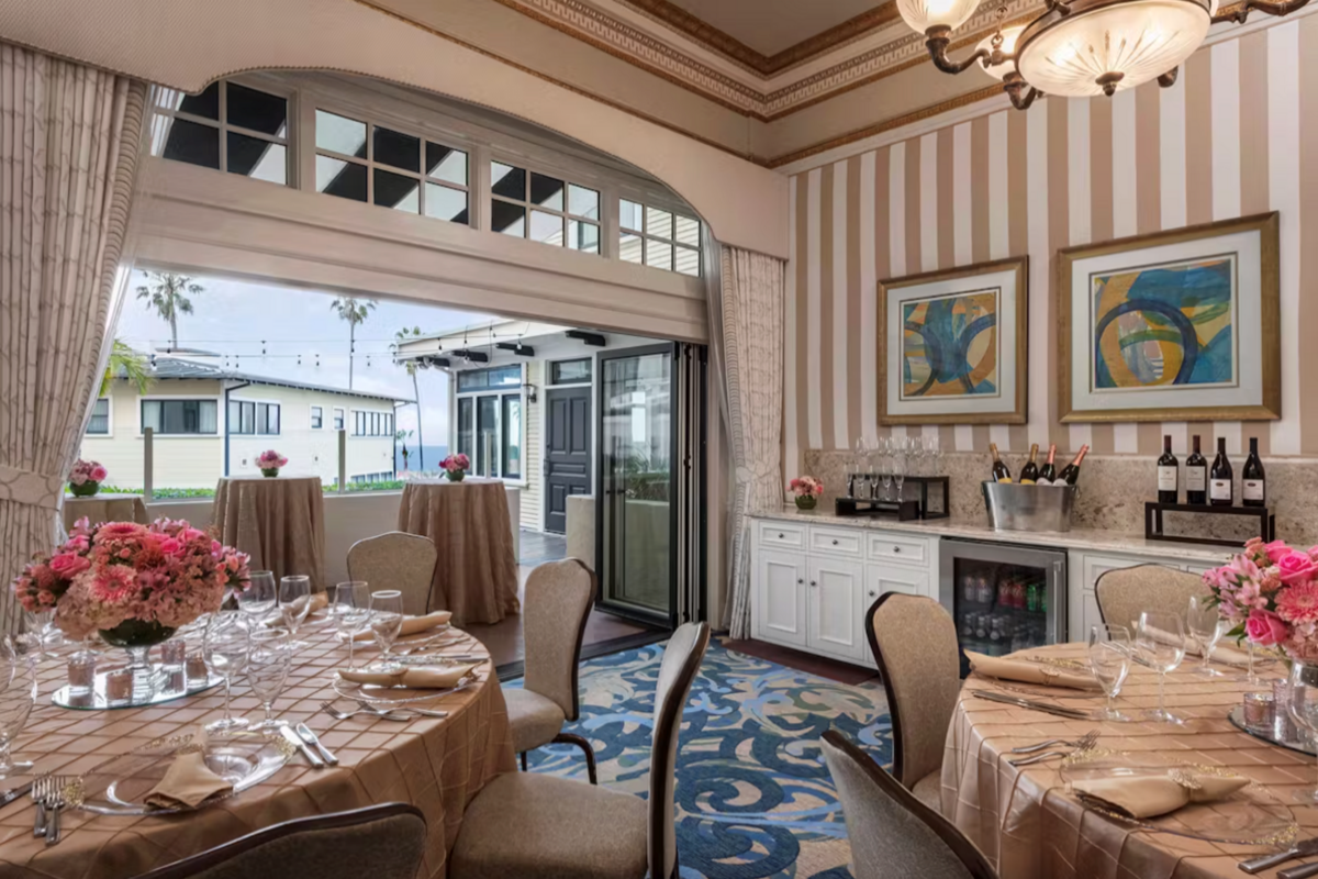 For private events, you can run a fully contained meeting-style meal in the La Jolla Room, which is 825 square feet with 13-foot ceilings and an in-room sound system. That room is sized for smaller groups, with seating formats that top out at 20 for a banquet and 20 for a reception-style setup.