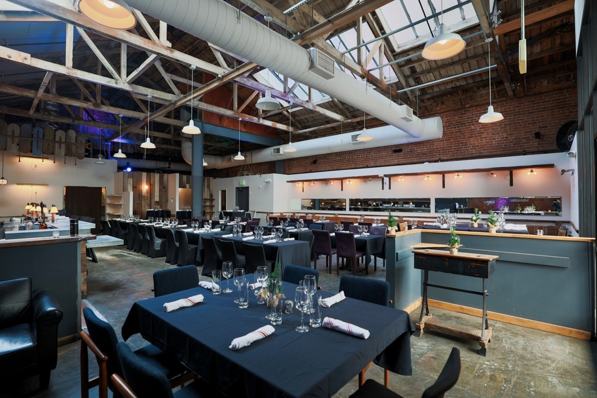 LongHouse sits two blocks from the Moscone Convention Center, a sunlit loft with exposed brick, reclaimed wood, and skylights that pour in natural light. The open floor plan accommodates up to 250 guests, featuring flexible zones suitable for both seated dinners and standing receptions.