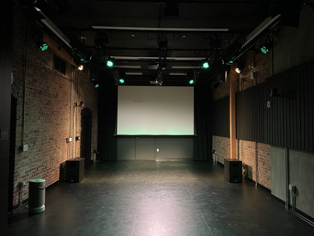 A black-box theater seats 66 or fits 94 standing, while an adjoining conference room doubles as a greenroom or breakout space. The open lobby can host check-ins, cocktail service, or rotating art installations on its hanging system.