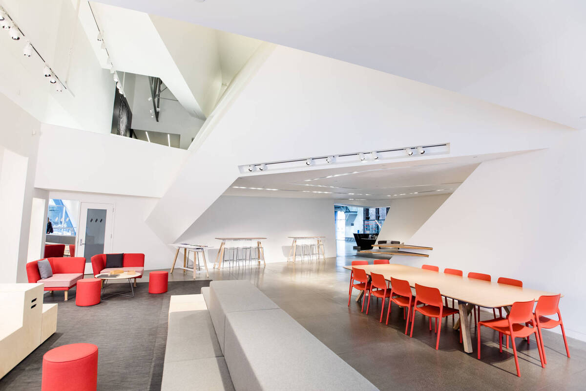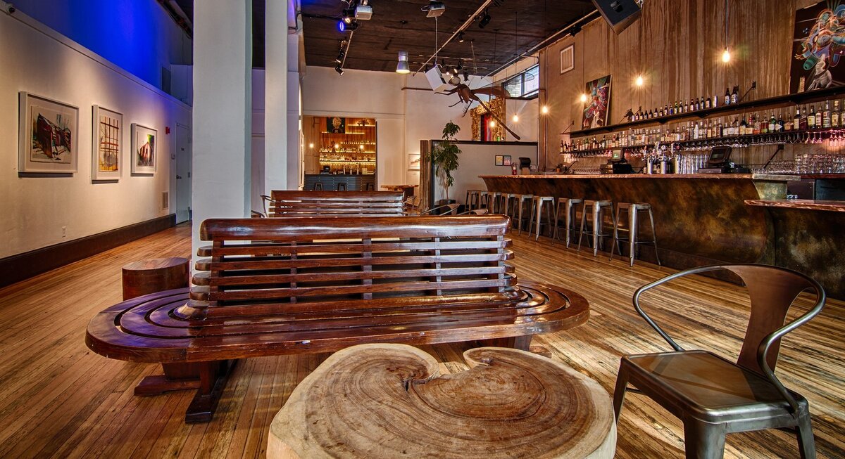 Sixteen-foot ceilings and floor-to-ceiling windows bring an industrial clarity that suits receptions, live performances, and product launches. Each gallery has its own bar, and a third service area, Red Door Coffee, doubles as a casual networking nook.