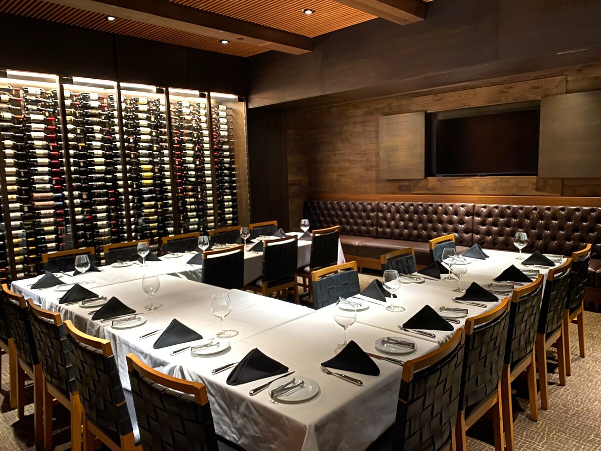 Fogo de Chão turns Brazilian churrasco into a polished private-event experience. The restaurant’s carved-wood walls and leather seating create a steady backdrop for tableside service by gaucho chefs carving roasted beef and lamb directly from skewers.