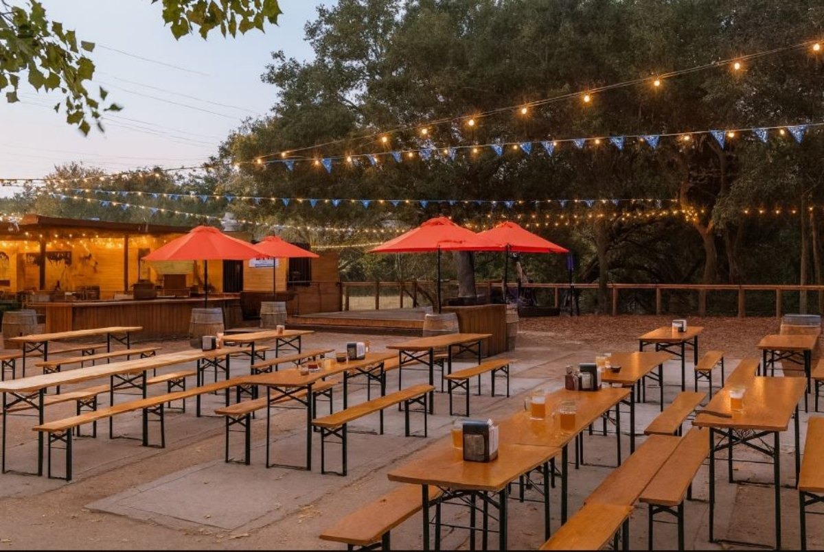 The setting is casual yet magical: reclaimed-wood seating beneath fruit trees, fire pits, and string lights glowing at dusk, and a laid-back soundtrack of live music on weekends. The venue is dog-friendly and family-friendly, ideal for daytime socials or evening celebrations under the stars.