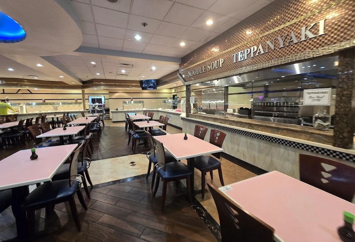 People can eat at different speeds, return for different dishes, and build their own meal without everyone needing to order in the same way. The buffet includes crab legs, sushi, teppanyaki noodle grill items, noodle soups, seafood bar selections, desserts, ice cream, cotton candy, s’mores, and a chocolate fountain.