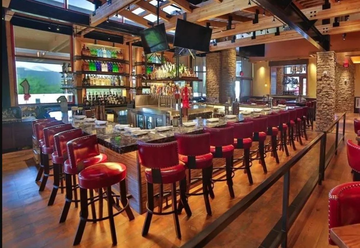 Lazy Dog leans fully into its mountain lodge aesthetic. You get the effect as soon as you step inside. The space has exposed wood beams, stone accents, leather seating, and fireplaces that give it a warm, slightly theatrical feel.