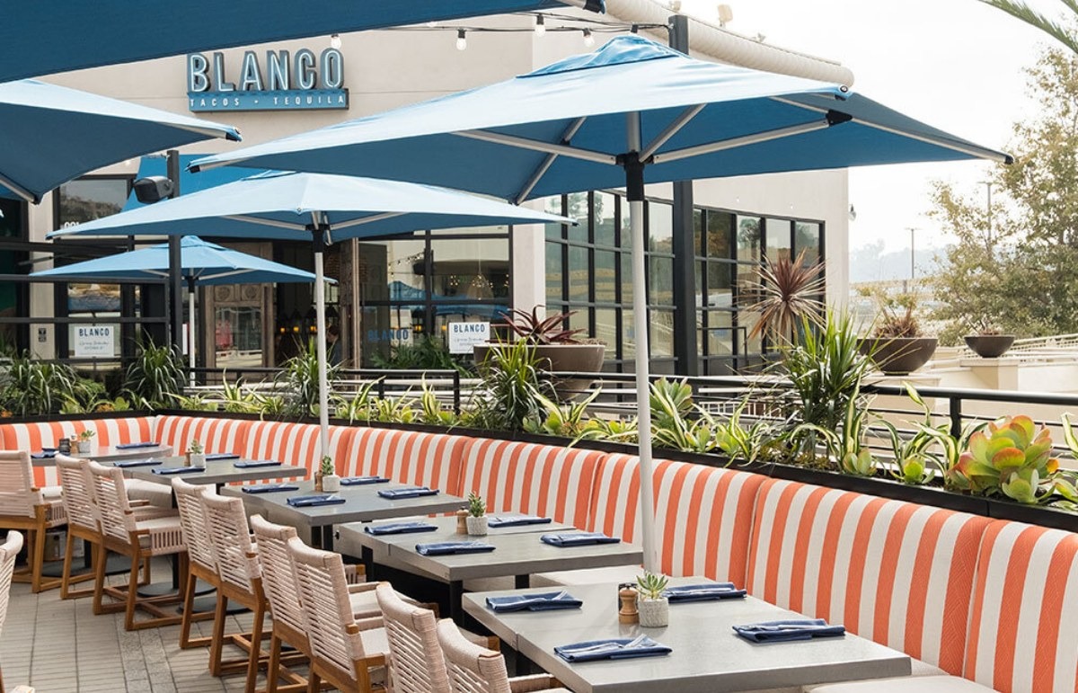 Blanco Cocina + Cantina is anchored by a large central bar, with warm wood finishes, white walls, big windows, and broad openings that connect the dining room to the patios. It feels polished and lively, more like an upscale-casual social spot than a traditional Mexican restaurant. And the indoor-outdoor flow gives it real momentum when the room fills in.