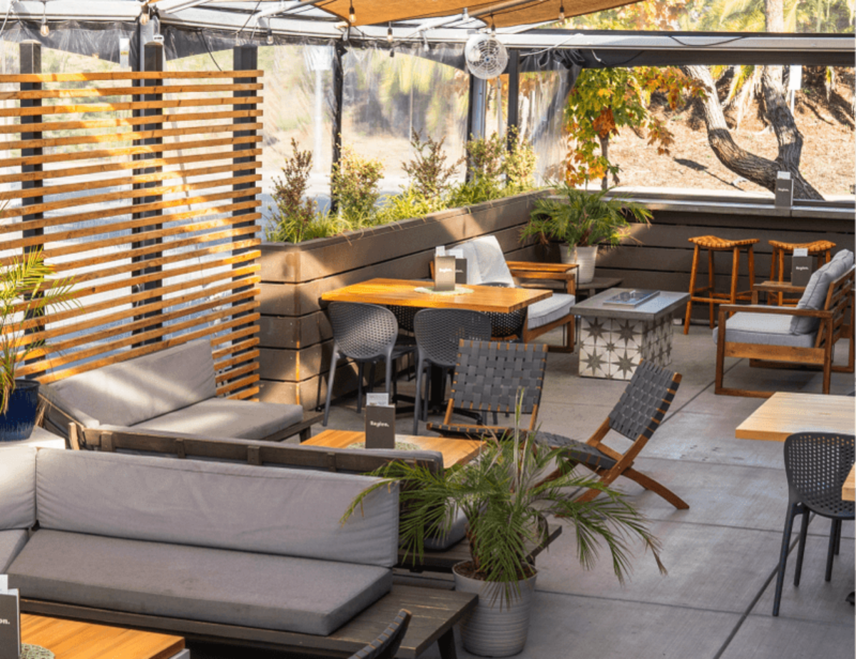 Inside, guests can settle into booths or gather at the bar, surrounded by glowing wood tones and gentle firelight. Outside, the patio and beer garden serve as the heart of the venue, shaded for summer and tented for winter.