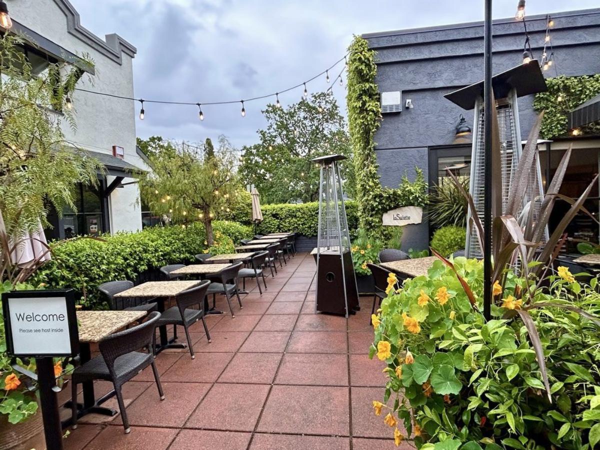 Sunflower Caffè sits directly on Sonoma Plaza, surrounded by tasting rooms and galleries. The building dates to the early 1900s, with a hidden back patio that’s now one of downtown Sonoma’s most flexible private spaces. The patio accommodates up to 45 seated or 60 standing guests, while the front café offers smaller indoor seating for breakfast or brunch events.